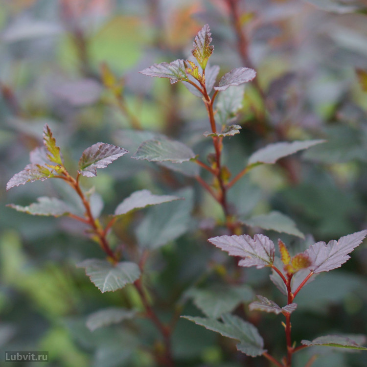 Крона у него плотная, по конфигурации напоминает перевернутый конус. Побегов много, их расположение густое. Растут ветви вертикально, цвет у них коричнево-красный. Степень облиственности у растения значительная. Конфигурация листвы трехлопастная, есть глубокие разрезы. На краях листьев присутствуют зазубрины, они довольно мелкие. В их окраске зеленый оттенок сочетается с бордовым и фиолетовым, к осени он становится более темным – коричнево-пурпурным. Молодые листья зеленые, с легким красноватым отливом. Окраска претерпевает изменения с течением времени.